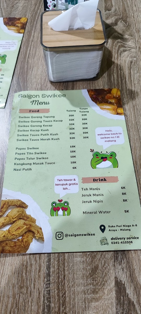 Welcome to Saigon Swikee, a culinary haven nestled in the bustling area of Ruko Puri Niaga Araya, Malang. This charming eatery specializes in swikee, a local delicacy featuring frog legs with roots in Chinese cuisine. The menu offers an irresistible selection, from scrumptious battered deep-fried frog legs to delectable sautéed options paired with fermented soya beans, known locally as tauco.